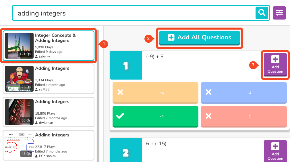 4. Select a Set on the left and add questions by selecting the “Add Question” to add individual questions or “Add All Questions” to add all questions to your set!